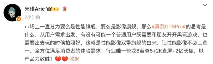 市场上一直分为要么是性能旗舰,要么是影像旗舰,那么真我GT8Pro的思考是什么,从用户需求出发,有没有可能一个普通用户既需要和朋友开开黑玩游戏,也需要出去玩的时候拍照好,这就是性能影像双擎旗舰的由来,让性能影像不必二选一,全方位满足消费者的体验需求!行业唯一骁龙8至尊5+2K直屏+2亿长焦,以产品力致胜!